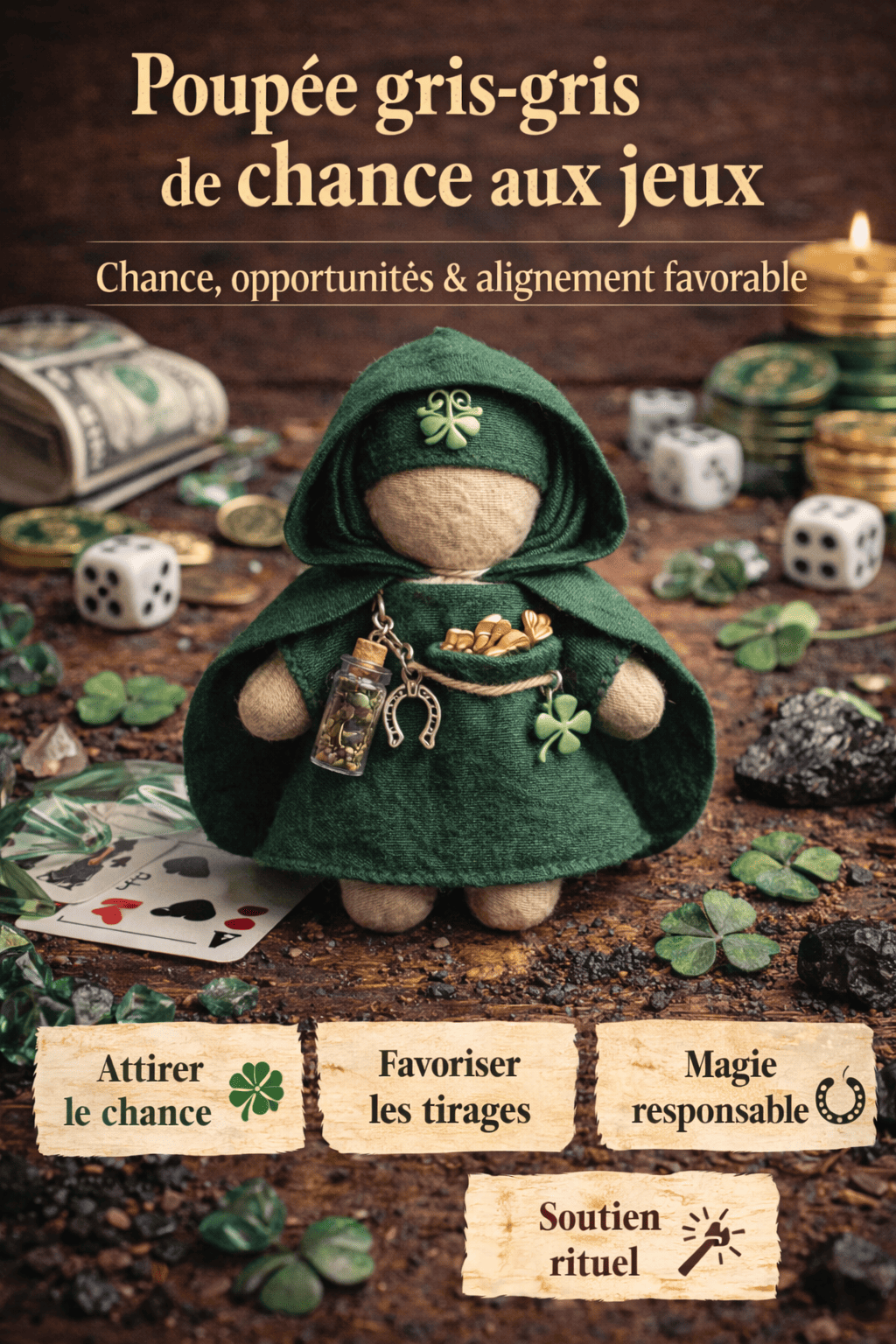 Une poupée gris-gris personnalisée pour attirer la chance, soutenir les opportunités favorables et accompagner vos jeux avec justesse.